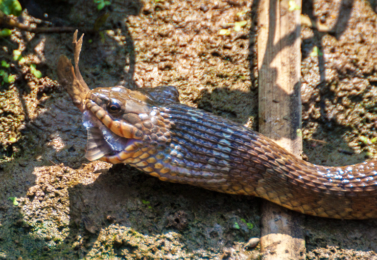 As I was walking along the boardwalk at my local marshland park, I heard some splashing in the shallow, muddy water and was surprised to see a Northern Water Snake (Nerodia sipedon) emerging from the water with a fish in its mouth. I did not see the snake actually catch the fish, but by the time I caught sight of it, the snake already had a firm grip on the head of the fish. I suspect that the snake had moved onto dry land to make certain that the fish had no chance of escaping.