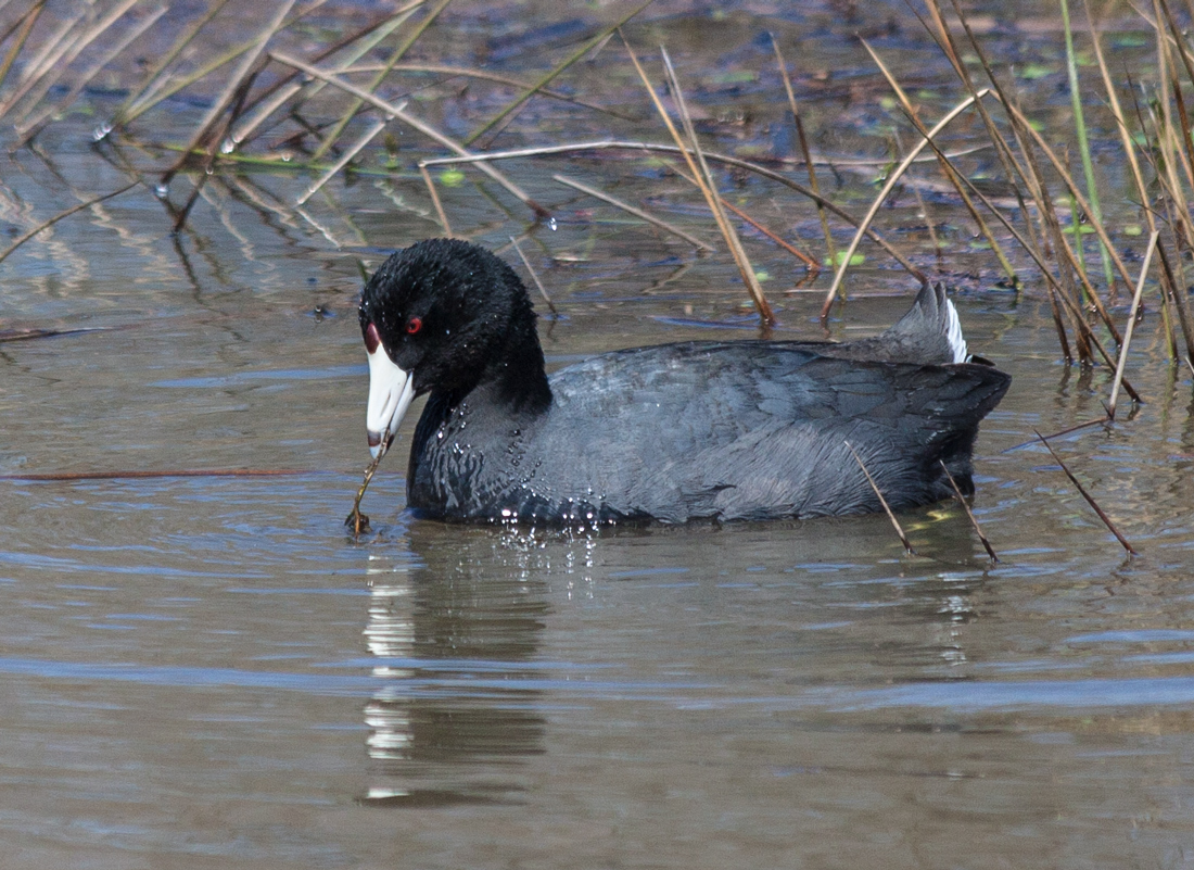 Technically, coots are not ducks, though, because they have lobed rather than webbed feet. The coots that day were too far away for me to get a shot of their feet, so I am instead including a photo I took in April 2017 that shows those lobed feet and the coot’s distinctive red eyes.