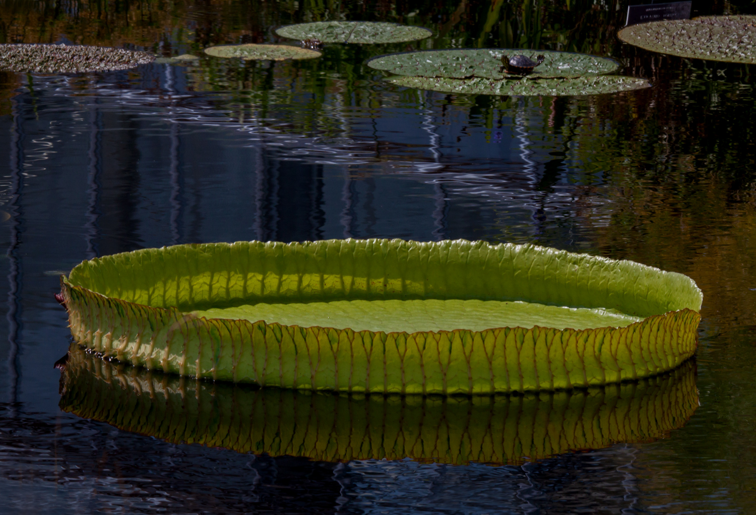 You can’t help but noticed that this is not your average lily pad. I believe that it is a tropical variety that comes from the Amazon River basin of the genus Victoria, possibly Amazonica victoria. According to Wikipedia, the leaves of this species can grow as large as 10 feet in diameter (3 meters), although this one was probably less than three feet (one meter) in size. Clearly it had no problem supporting the weight of the little frog.