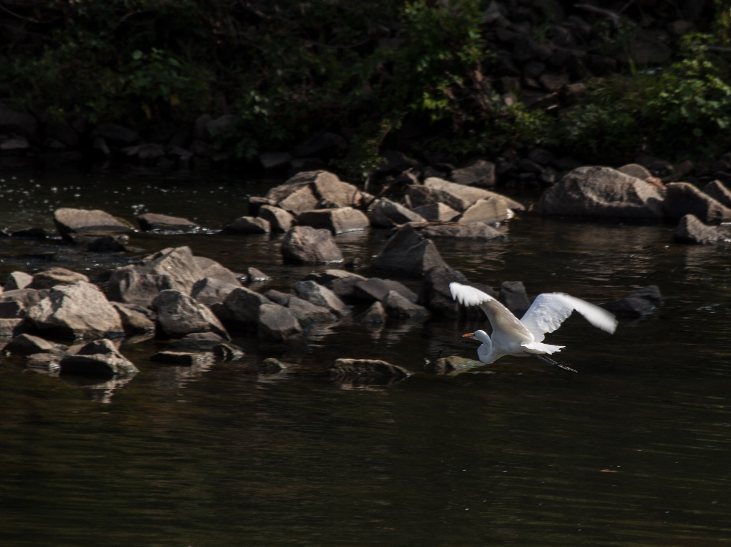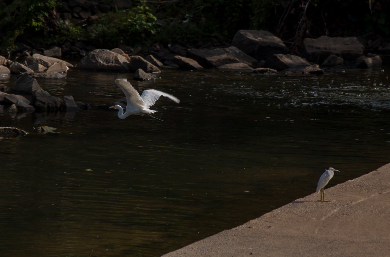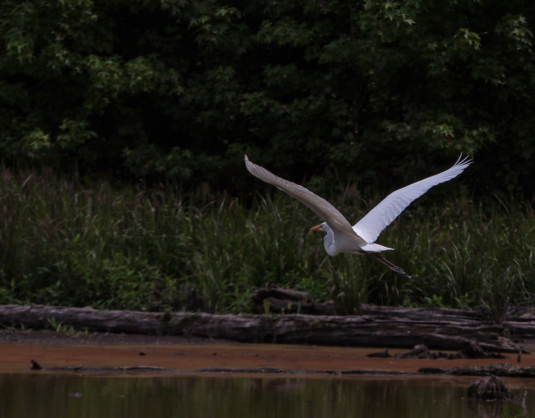 I had anticipated that this would happen, and managed to capture a few shots of the egret in flight. I was fortunate that the egret flew only a short distance to a nearby pile of branches and remained there, allowing me time to compose some additional shots.