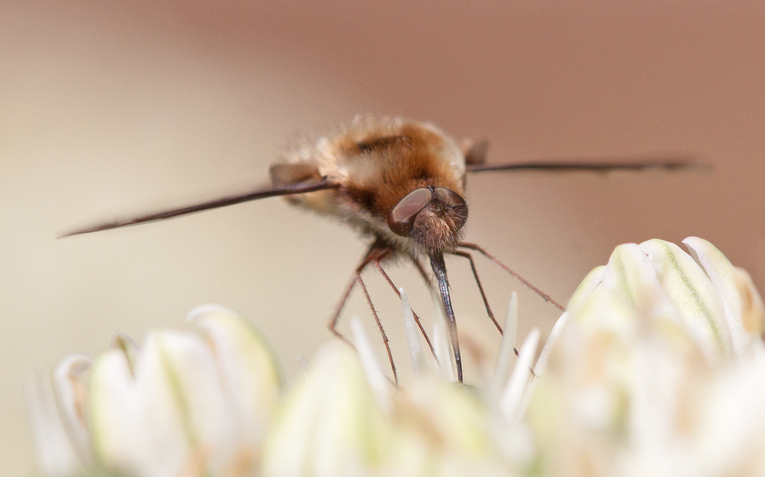 When I did a little research, though, I learned that bee flies have a dark side. According to an article entitled “A Pollinator With a Bad Reputation” by Beatriz Moisset, “The reason why it diligently hovers over bare ground early in the spring is that it is looking for bee nests, probably the same ones with which they compete for nectar. The bees dig tunnels and lay their eggs at their bottoms after collecting enough pollen to feed the larvae. This requires numerous trips, thus the bee fly takes advantage of the mother’s absence and lays its eggs in such nests. Making use of its flying prowess, it does not even need to land but it flicks its abdomen while hovering over the open burrow, letting one egg fall in or near it. The fly larva finds its way to the chamber where the mother bee has laid the provisions and the egg and proceeds to feed on the stored pollen. Afterwards it devours the bee larvae; when it is fully grown, it pupates and stays inside the nest until next spring.”
