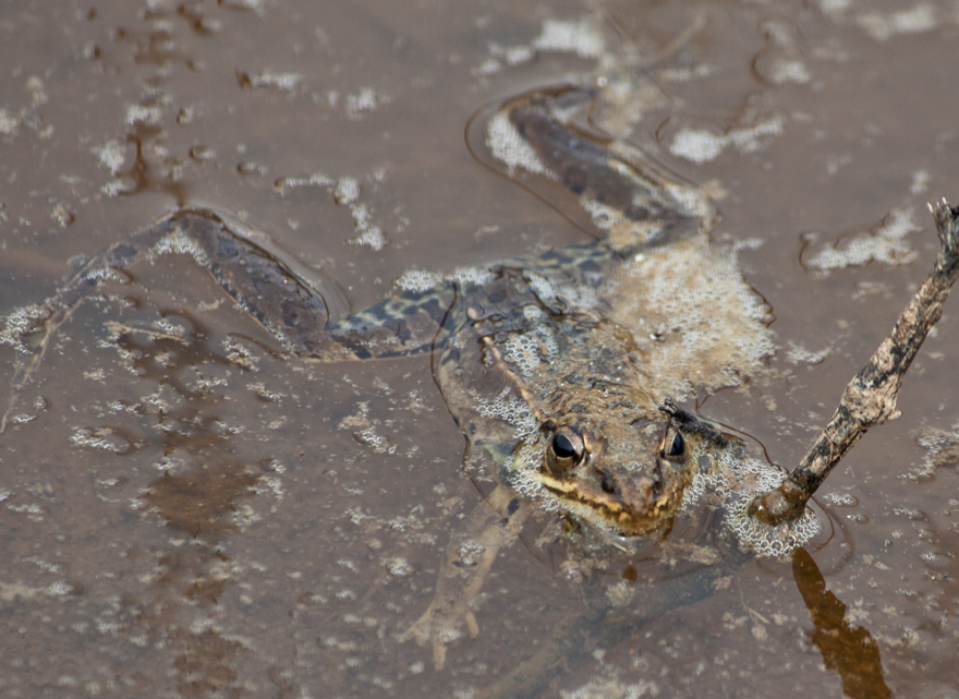 With a mixture of horror and fascination, I watched as a large black snake slowly ingested a Southern Leopard Frog (Lithobates sphenocephalus) that it had caught on Friday at Huntley Meadows Park. The frog was struggling and crying out loudly and then suddenly it was free. The lucky frog hopped away and the snake could only tell its friends about the one that got away.