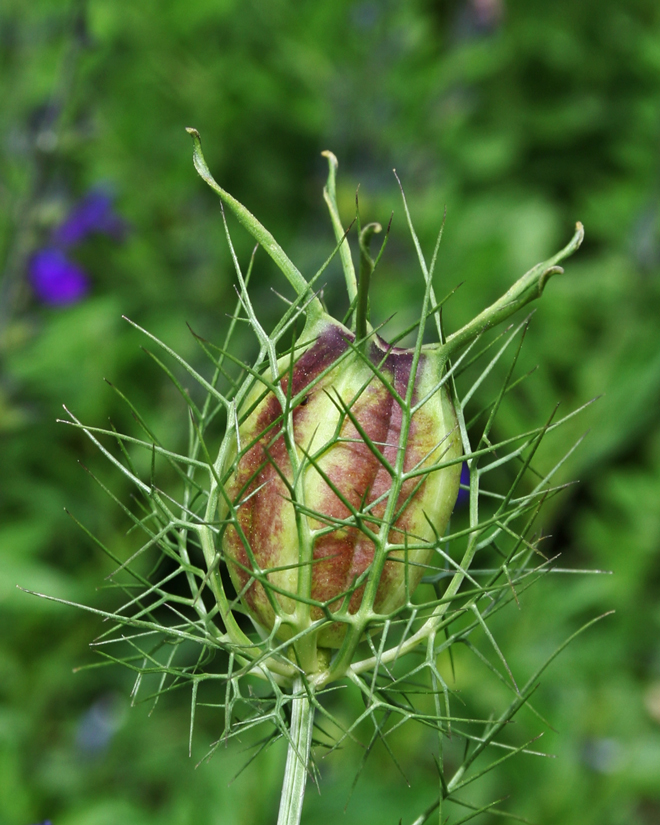 I find this flower to be incredibly beautiful and exotic and it is one of my favorites. Typically Love-in-a-mist is blue, but it also comes in shades of white, pink, and lavender. Many flowers lose our interest after they have bloomed, but I find the seedpods of Love-in-a-mist to at least as intriguing as the flower itself, as you can see in the final photo.