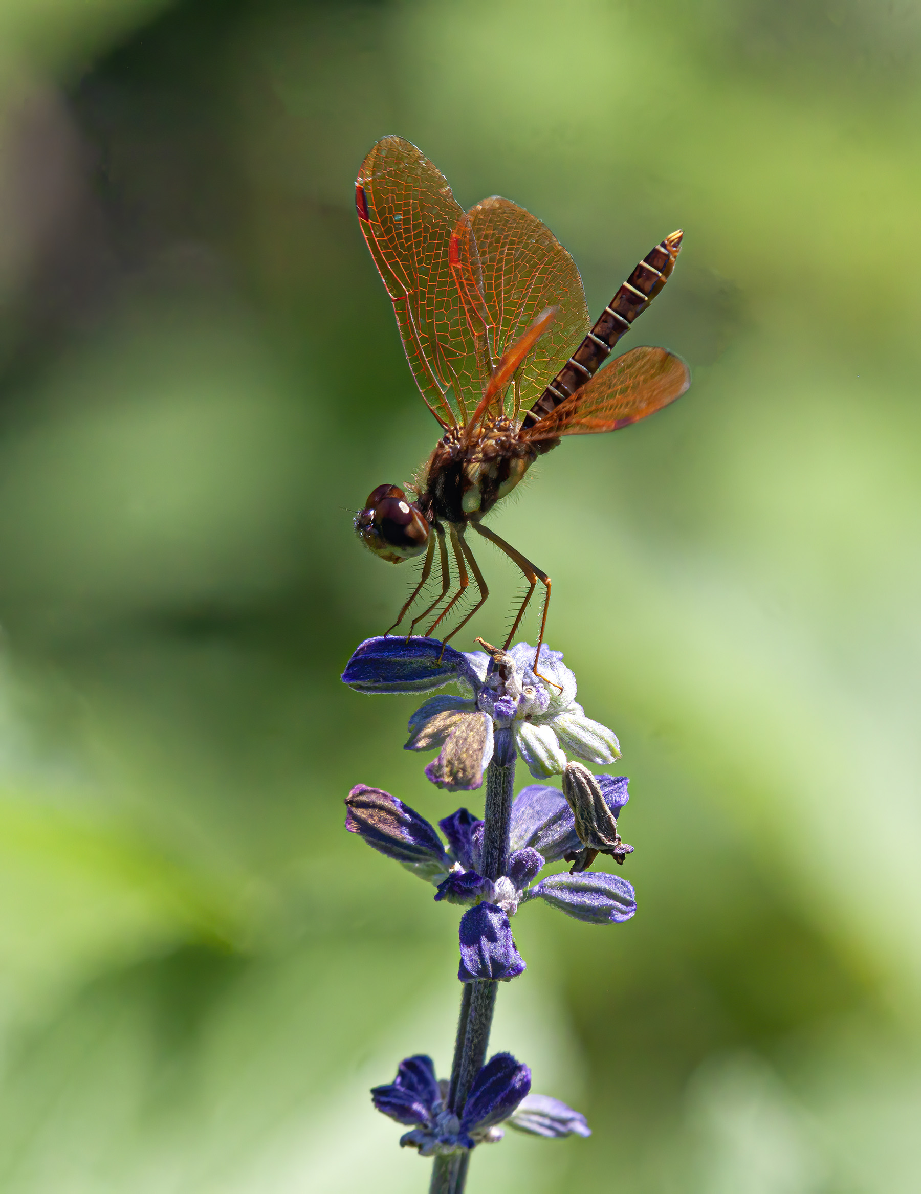In the first photo, I love the ways that the shadows of the wings of this female Common Whitetail dragonfly (Plathemis lydia) create the optical illusion that the dragonfly has extra wings. In the second photo, the female Blue Dasher dragonfly (Pachydiplax longipennis) is quite beautiful herself and the stunning background enhances that beauty.