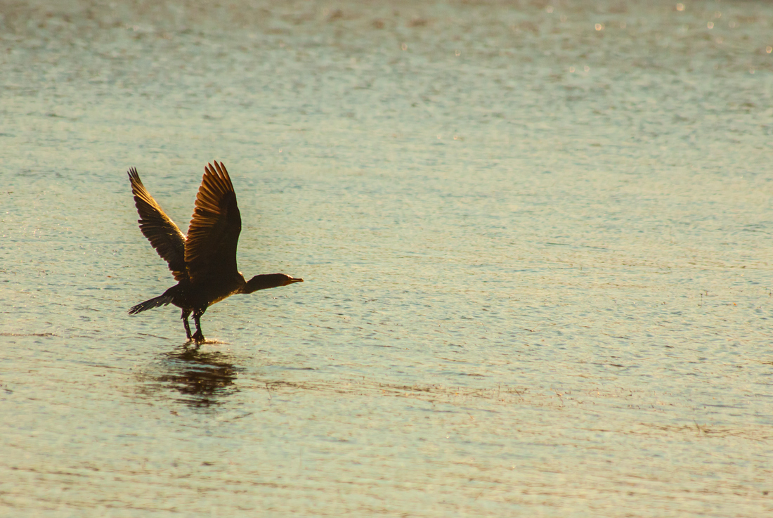 The second image was one of my earlier attempts. The cormorant surfaced closer to me than in the first shot, but the surface of the water was not as colorful as I wanted. However, the shot provides a really good look at the striking aquamarine eyes of this beautiful bird. Wow! Those eyes never fail to startle and delight me.