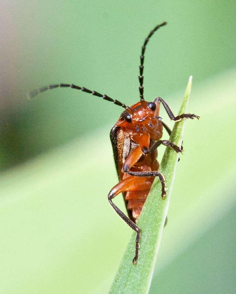 When I looked at the photos initially, I thought I had captured images of a Red Milkweed Beetle (Tetraopes tetrophthalmus), because of its bright red body and curved, segmented antennae. (I have a self-identified obsession with this insect that I discussed in a blog posting last year.) However, there were a few problems with that identification. This beetle seemed smaller; it was on a plant that was definitely not a milkweed plant; and it seemed too early to be seeing a milkweed beetle. My identification was further complicated by the fact that I never did see the back of the beetle.