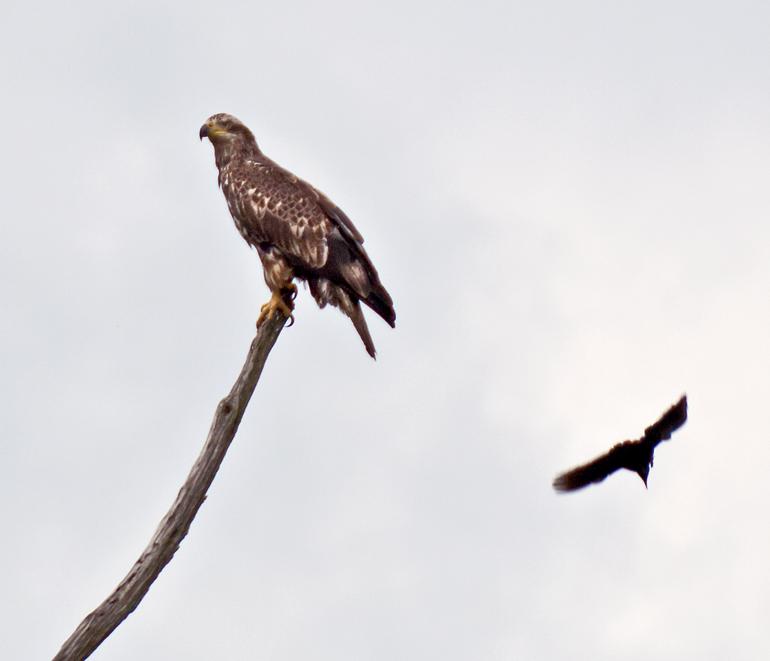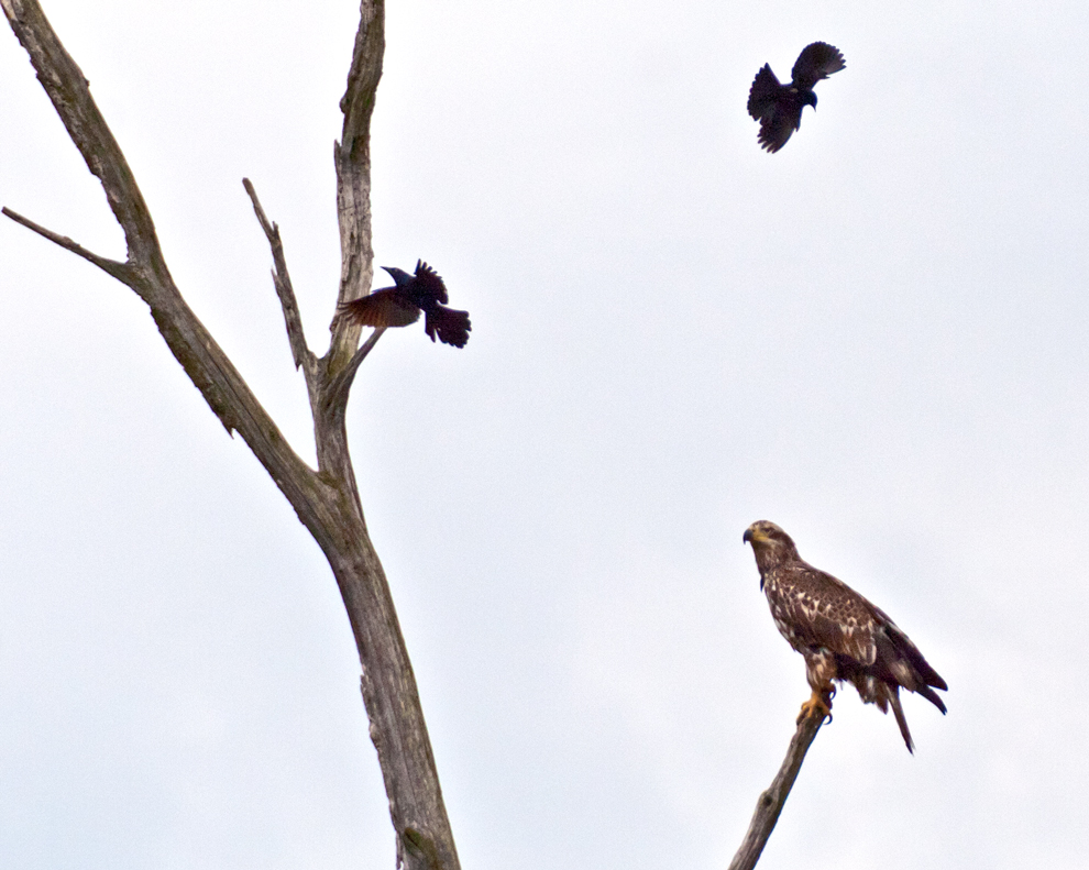 I love watching the interaction between different species, whether it be birds, reptiles, animals, or insects. Sometimes there is a kind of peaceful coexistence and sometimes, as was the case here, there is confrontation. Previously, I observed a group of blackbirds harassing a juvenile eagle, but this time the blackbird seemed to be alone.