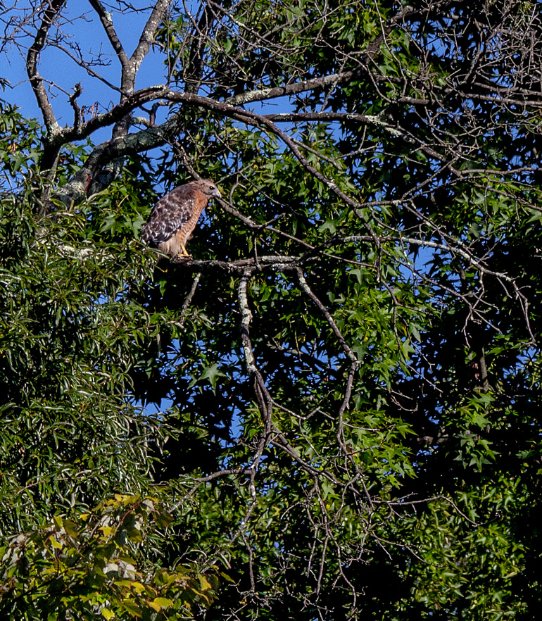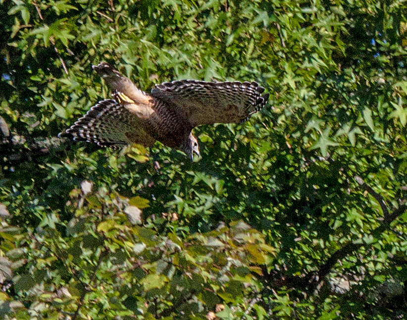I was fortunate to be in the right place when one hawk started crying. From the cry, I knew that the hawk was nearby, but I had trouble locating it as I scanned the trees. Finally I spotted it, a juvenile Red-shouldered Hawk (Buteo lineatus). I snapped off a couple of images and then started to adjust the camera’s settings. I had barely taken the camera from my eye when the hawk took off.