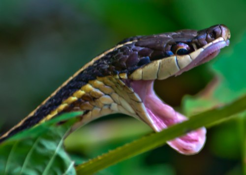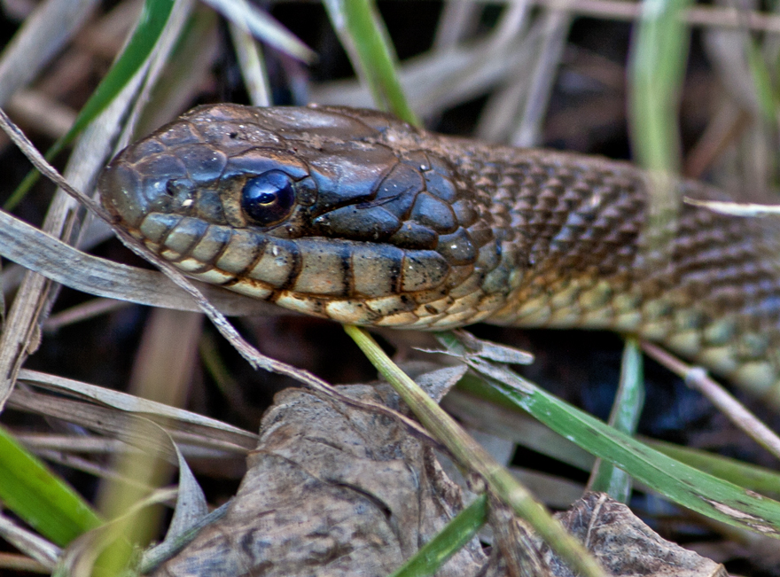 When I first spotted the snake, it was holding the frog in the air. It appeared to have grabbed the frog by one of its back legs and was trying to adjust the frog so that it could swallow it. Unlike a Great Blue Heron that swallows its prey in a single gulp, the snake has to pull its prey in slowly. Little by little the snake seemed to get more of the frog’s leg in its mouth.