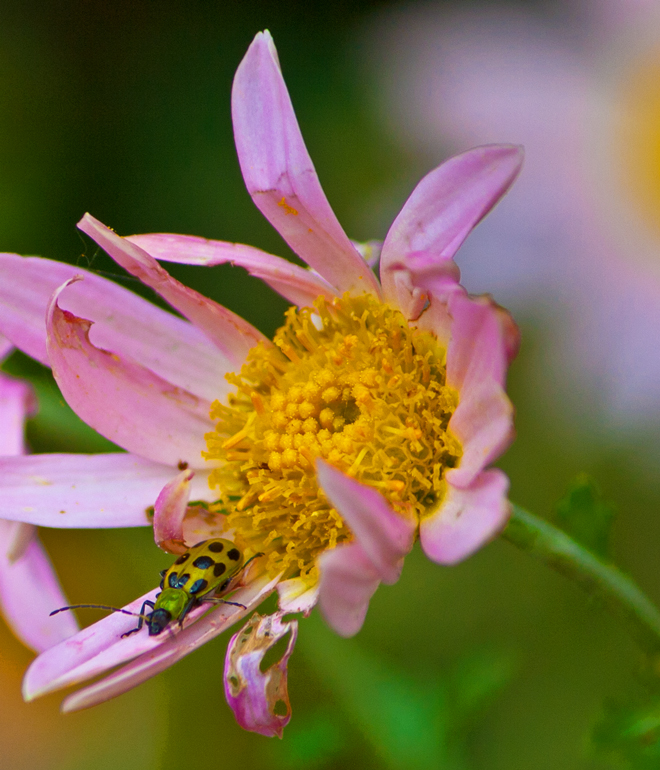I was tired and a little impatient, so I decided to photograph the beetle with the “wrong” lens. In retrospect, I am happy that I made that decision, because I ended up with an image that I really like. Yes, the beetle is still there, but the shape and positions of individual buds of the flower are what make this image stand out for me.