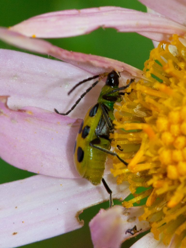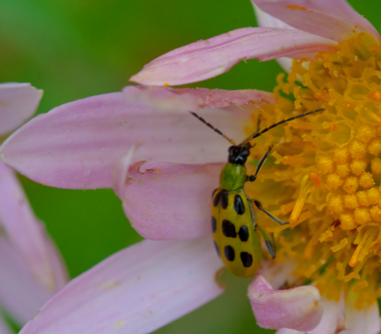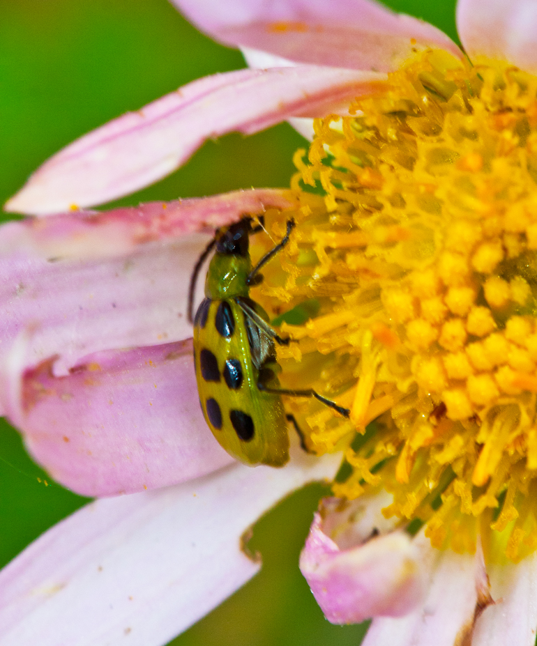The day was winding down as I retraced my steps back to entrance of Green Spring Gardens, when I caught a glimpse of a Spotted Cucumber beetle (Diabrotica undecimpunctata). My initial instinct was to switch from my 55-250mm telephoto zoom lens to my 100mm macro lens so that I could fill the frame with this colorful little insect on a single flower.