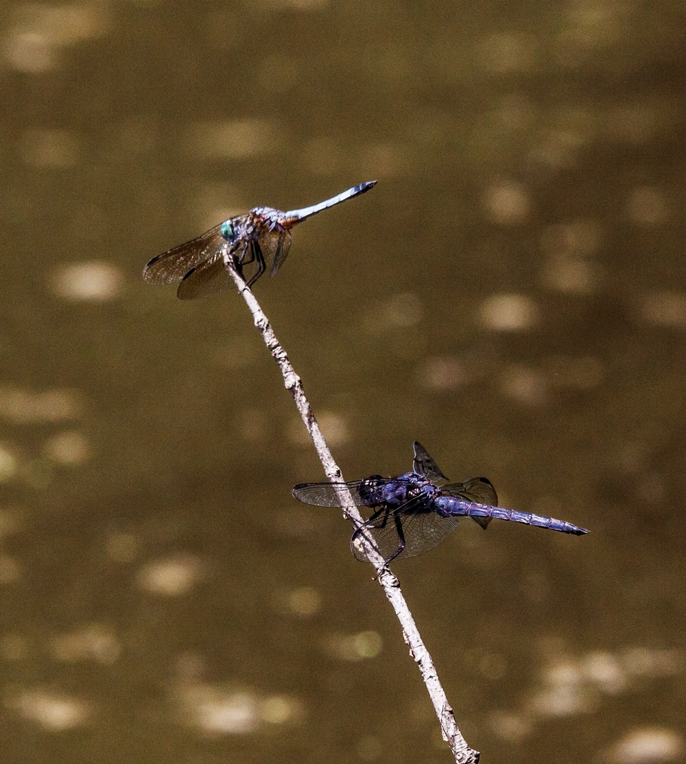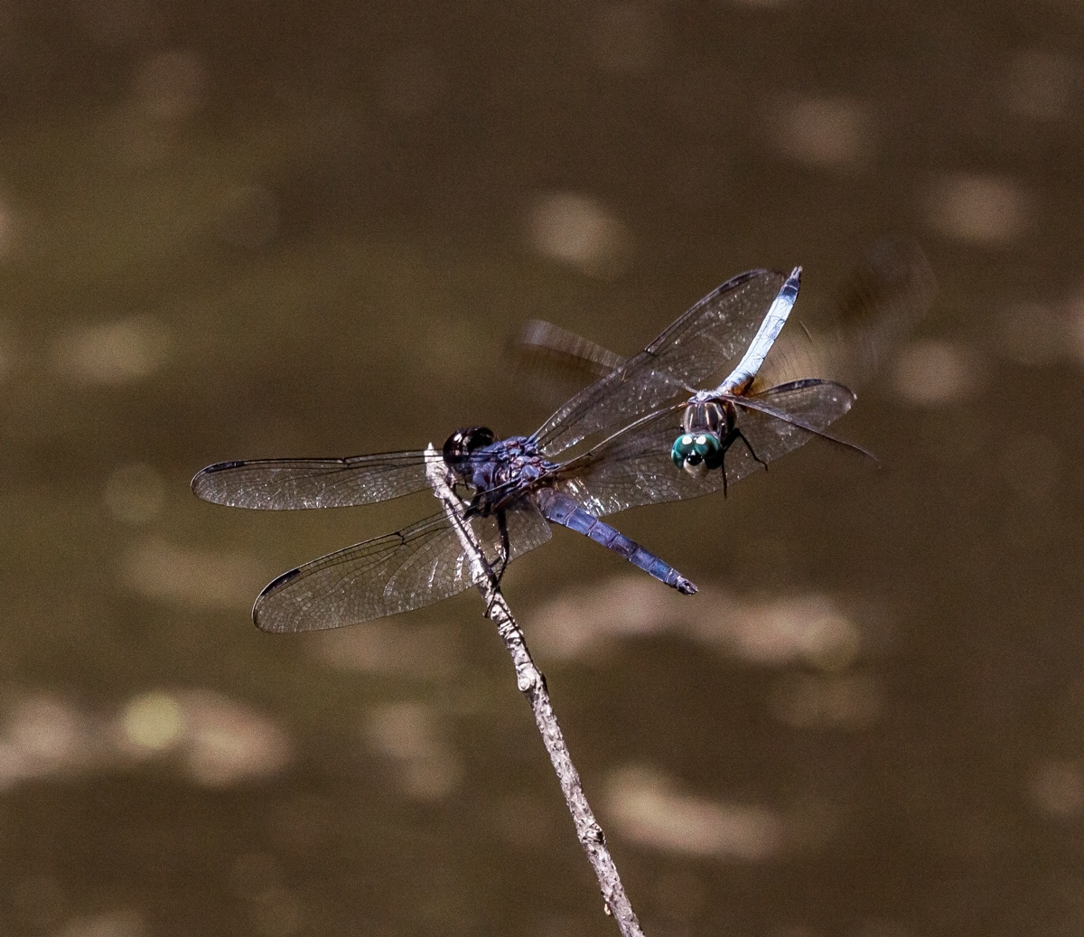 I took a few breaks to get some shots of the more cooperative damselflies, but persisted in my quixotic efforts to capture the dragonflies in flight. Over the course of a couple of hours, I managed to fewer than a dozen images that are more or less in focus. I think that my subjects for this shoot might be Common Baskettail dragonflies (Epitheca cynosura), but I’m not very confident in that identification.