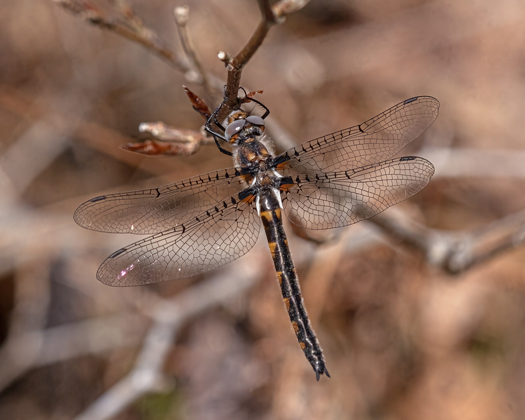 How did we not notice immediately that this was a different species? One of the primary differences between the species is that Uhler’s Sundragons have amber-colored markings mixed with dark ones at the base of their wings, while Selys’s Sundragons have only the dark markings. Given the small size of these dragonflies, these differences are hard to spot in the field, but are much easier to see when reviewing images afterwards.