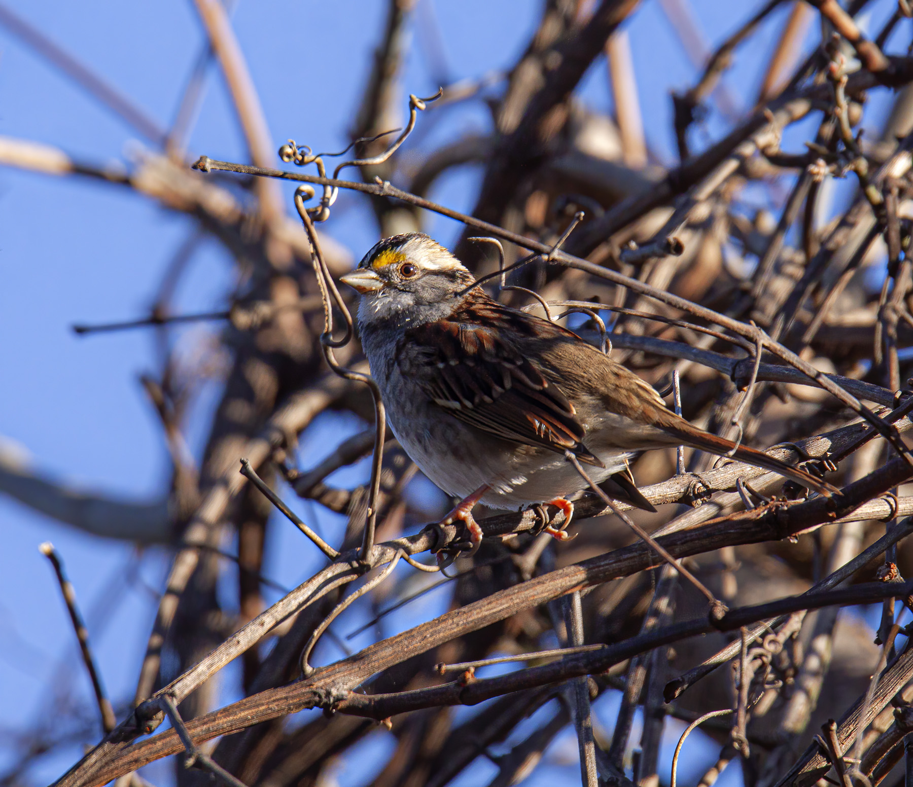 Last week I spotted this White-throated Sparrow (Zonotrichia albicollis) in a patch of sumac at Occoquan Bay National Wildlife Refuge. Frequent readers of this blog will undoubtedly remember that I have featured a variety of birds in this same patch, which provides berries during a time of the year when food sources are severely limited.